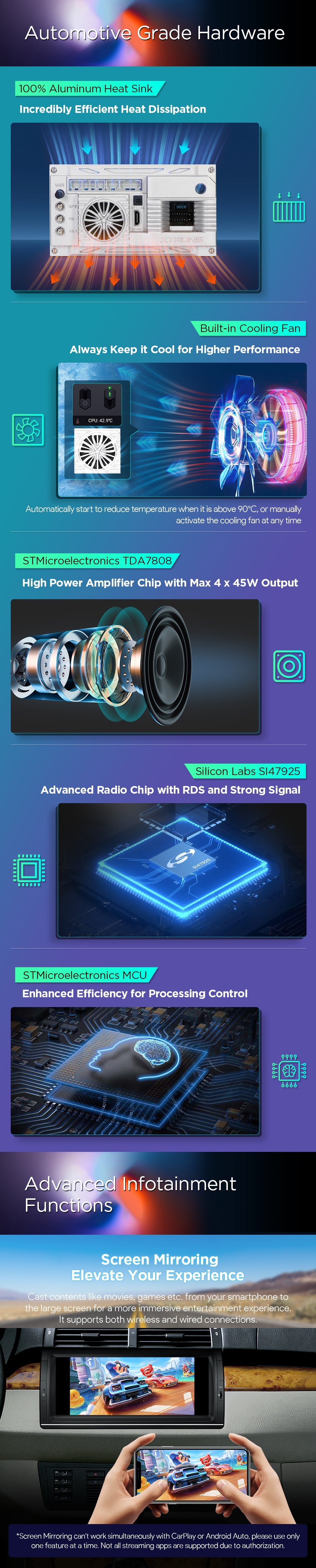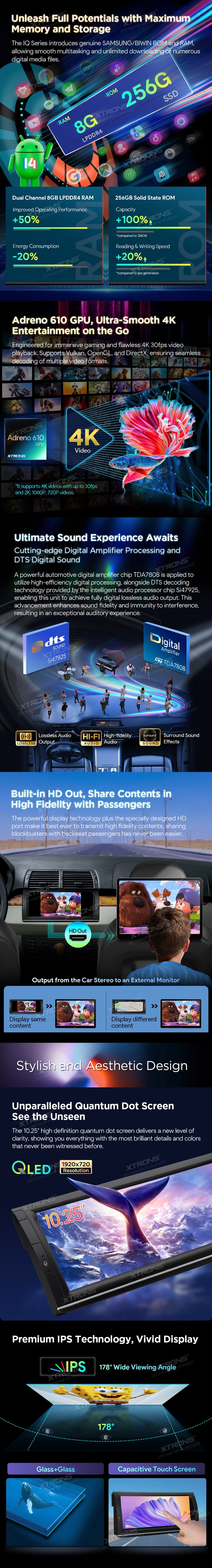 *Android 14 64 bit s 8GB RAM (LPDDR4), 256GB ROM (SSD) *Qualcomm Snapdragon 665 Platforma A73 *4+A53*4 11nm proces až 2,0 GHZ *Adreno 610 GPU/ Podpora 4K Video *Zpracování digitálního zesilovače a digitální zvuk DTS -STMicroelectronics TDA7808 Zesilovač s výkonem Max 4x45W -Silikonické laboratoře SI47925 DSP *Výstavný HDMI&Pe-fiber&RCA Výstup *10.25 palc 1920 * 720 Resolution QLED IPS G+G dotyková obrazovka *Síťujte 4G LTE síť, podpůrte dopravcům v Asii a Evropě * Chytré uživatelské rozhraní s denním a nočním režimem *Bilt-in Wireless CarPlay a kabelové a bezdrátové Android Auto *Podpora Micro-SIM karty *Dual Band WiFi modul (2.4GHz & 5GHz) *Screen zrcadlení *100% hliníkové tepelné dřezy a vestavěný ventilátor pro efektivní rozptyl tepla *Podpora 1920 *1080P AHD Fotoaparáty * Optimalizovaný Canbus Dekódování *Pravná GPS navigace *Nejnovější Bluetooth 5.0 *Multimedia USB/SD Vstup * Použitelné pro BMW X5 E53 (1999-2006) *Volitelné funkce (Potřebné Příslušenství Extra Příslušenství) -Kamera, OBD, DAB+, DVR, TPMS, Mikrofon a klávesnice