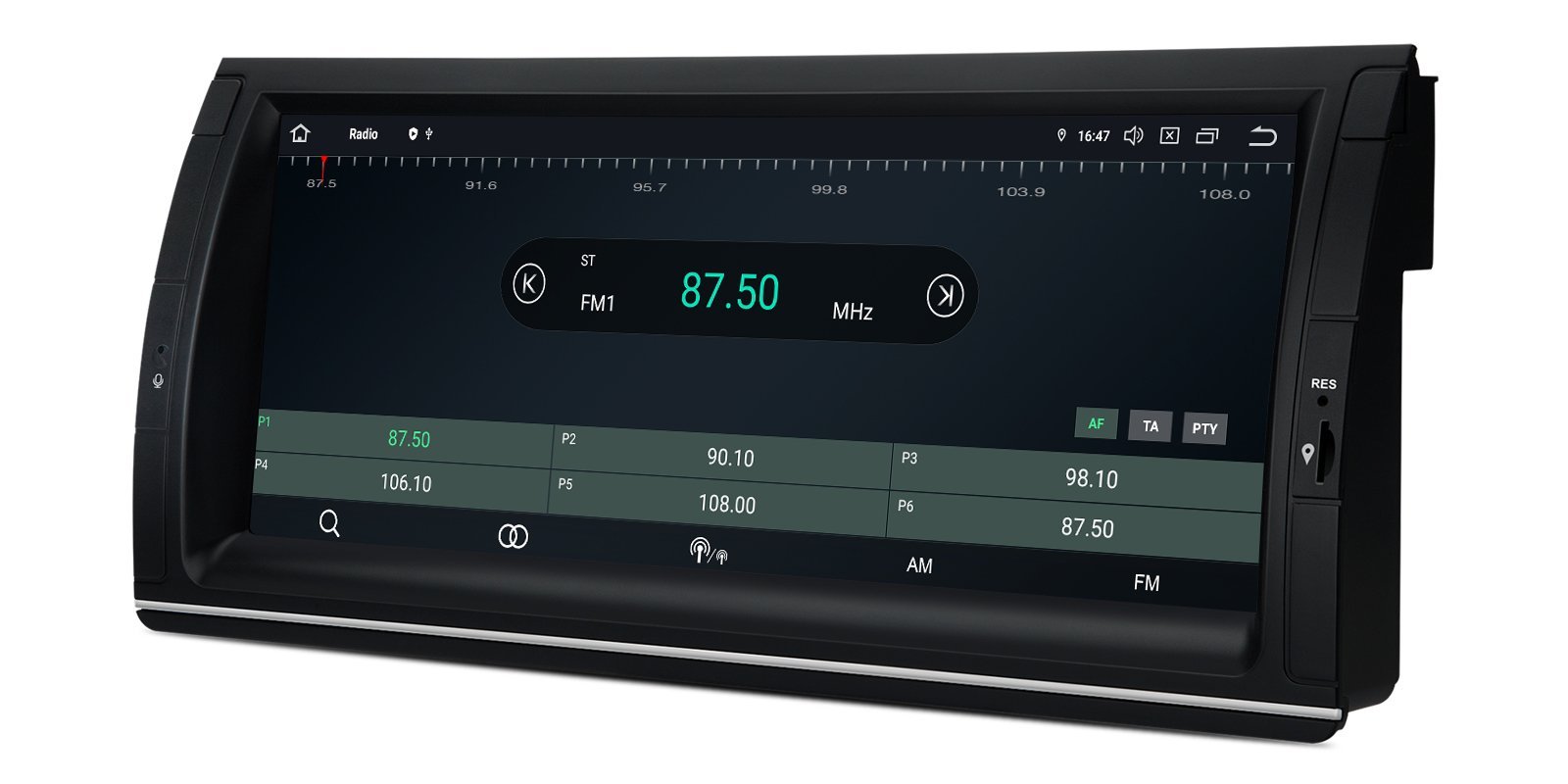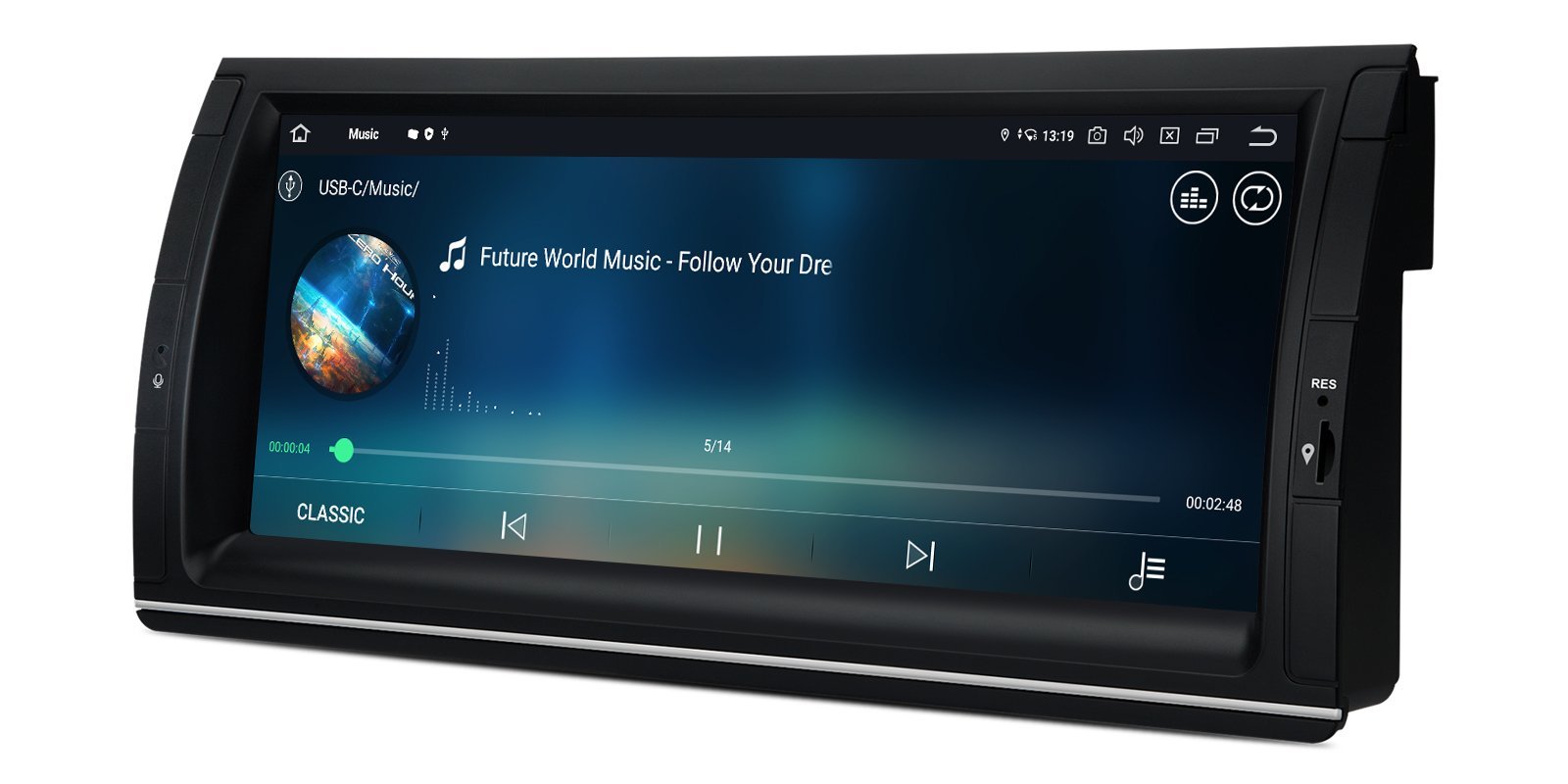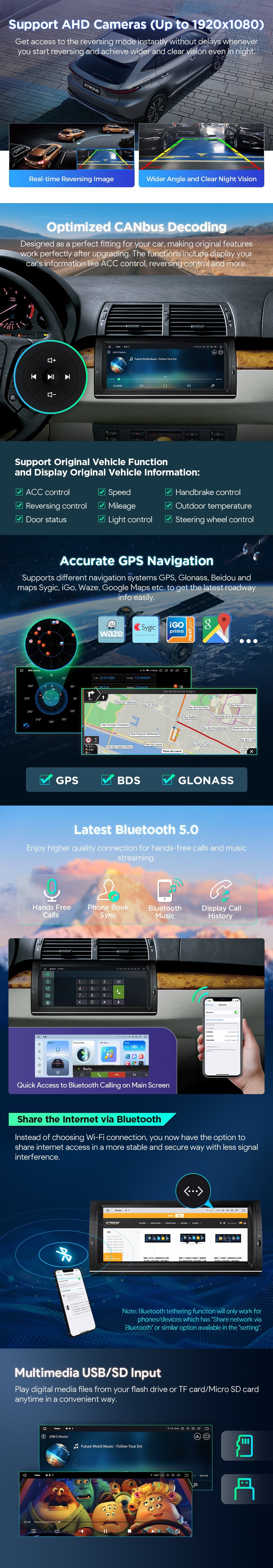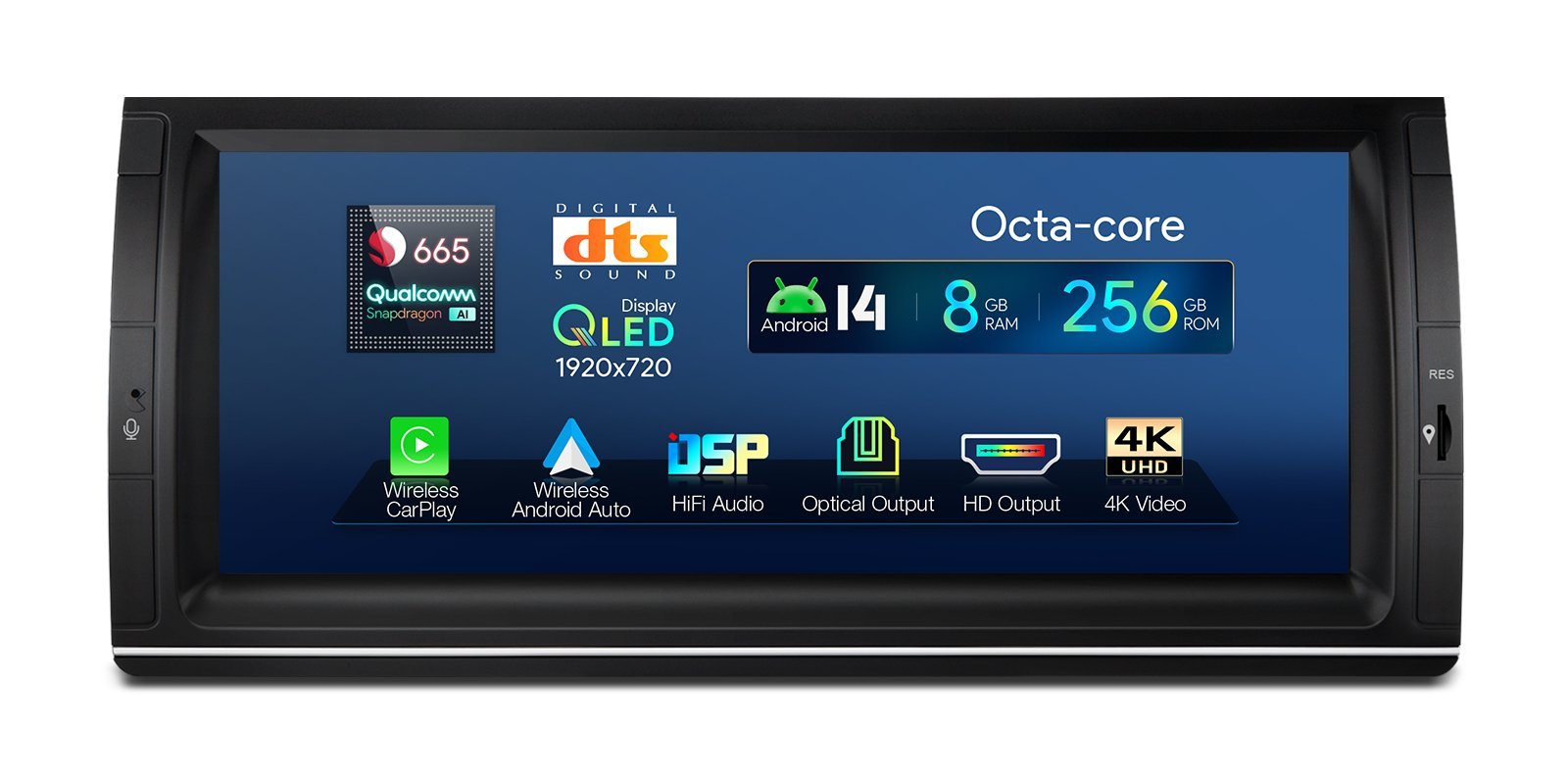 Android 14 Octa Core 4GB DDR4 RAM + 64GB Solid State ROM 10,25'' 1280x480 kapacitní dotyková obrazovka Car Stereo GPS navigační systém s integrovaným globálním 4G řešením, vestavěný CarPlay & Android Auto & AKM DSP & Gryoscope senzory, rádio SI4755 s RDS, zesilovač TDA7388, USB Tethering, podpora AHD kamer, přehrávání 2K videa pro BMW X5 E53