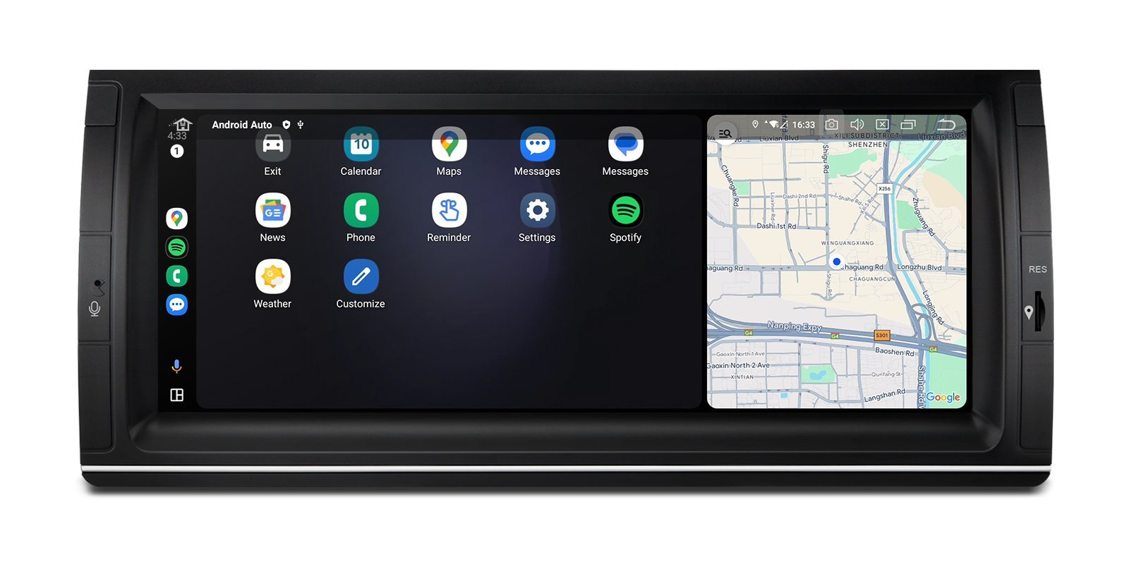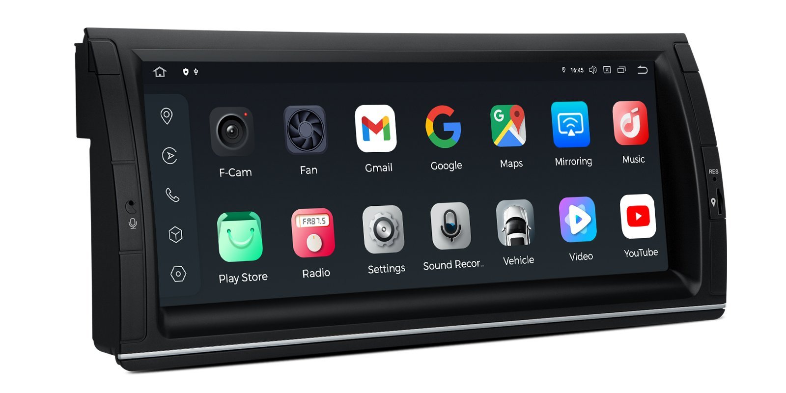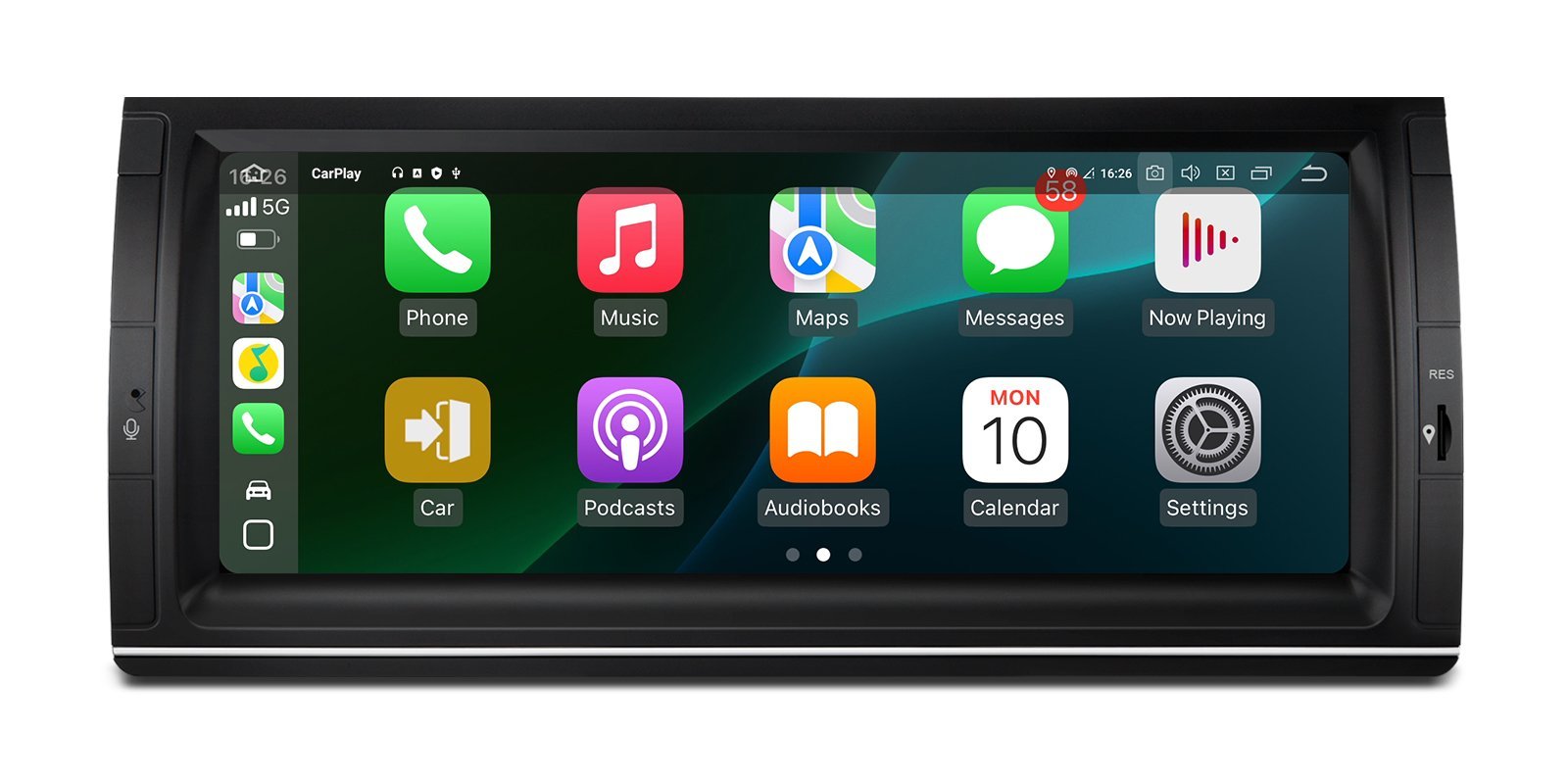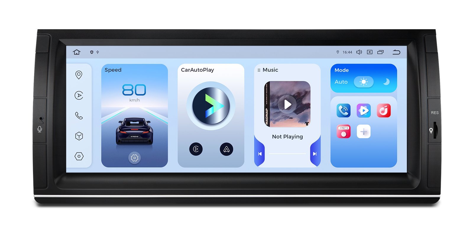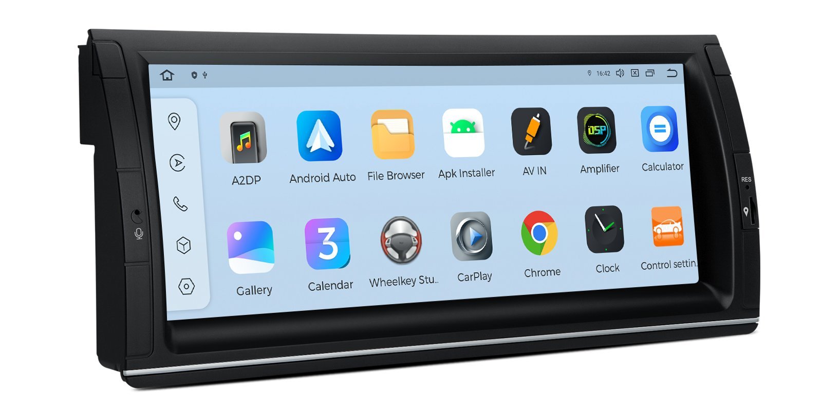 Android 14 Octa Core 4GB DDR4 RAM + 64GB Solid State ROM 10,25'' 1280x480 kapacitní dotyková obrazovka Car Stereo GPS navigační systém s integrovaným globálním 4G řešením, vestavěný CarPlay & Android Auto & AKM DSP & Gryoscope senzory, rádio SI4755 s RDS, zesilovač TDA7388, USB Tethering, podpora AHD kamer, přehrávání 2K videa pro BMW X5 E53