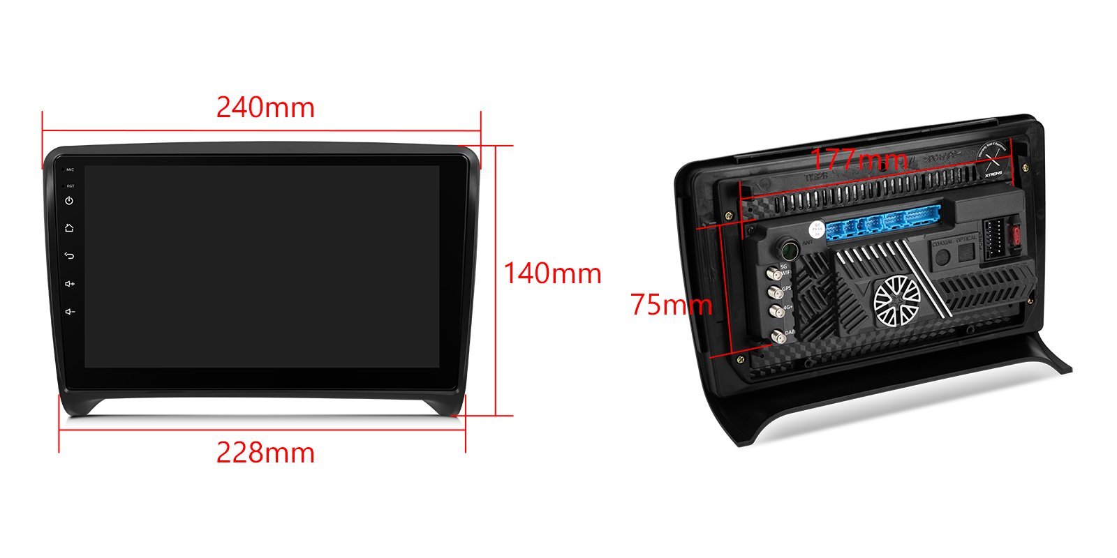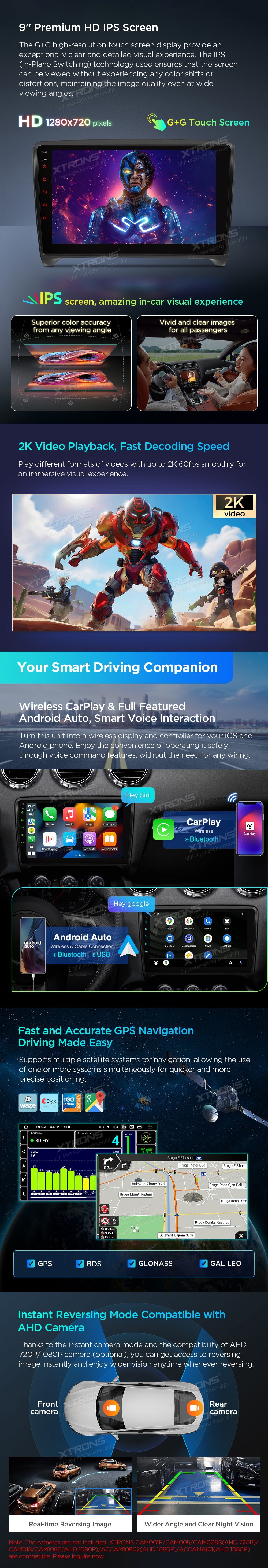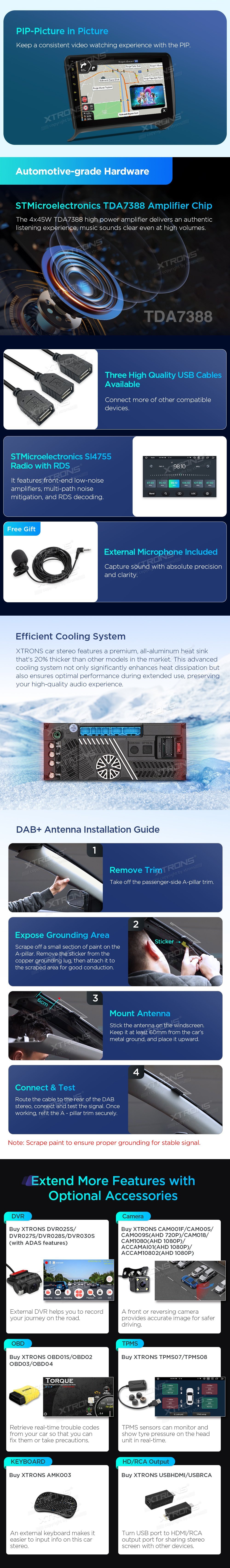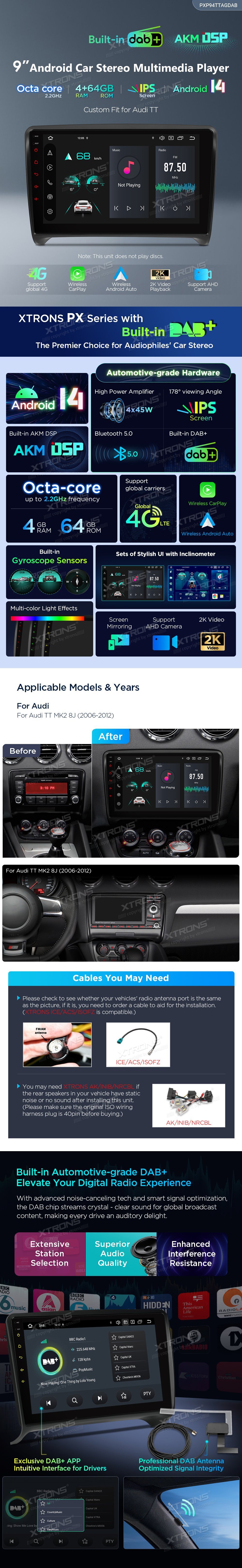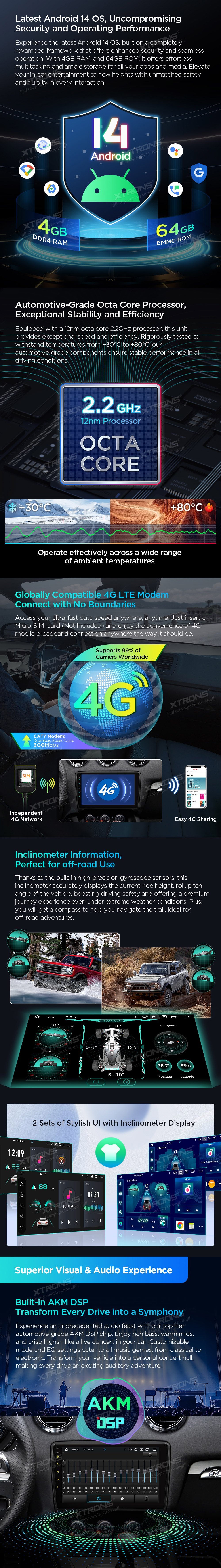 *Android 14 se 4 GB RAM DDR4 + 64 GB ROM EMMC *12nm osmijádrový procesor až 2,2 GHz *9palcový dotykový displej Premium HD IPS G+G s rozlišením 1280*720 * Vestavěné DAB+ *Vestavěné globální 4G LTE *Vestavěné gyroskopické senzory *Vestavěný AKM DSP *Přehrávání videa ve 2K *2 sady stylového uživatelského rozhraní s inklinometrem *Vestavěné bezdrátové CarPlay a plně funkční bezdrátové a kabelové Android Auto *Rychlá a přesná GPS navigace *Okamžitý režim couvání kompatibilní s AHD kamerou *Optimalizované dekódování CANbus -Ovládání na volantu *Dynamická atmosféra s všestrannými vícebarevnými LED světly *Zrcadlení obrazovky *Nejnovější Bluetooth 5.0 *Dvoupásmový WiFi modul (2,4 GHz a 5 GHz) *Sdílení mobilní sítě přes USB tethering *PIP - obraz v obraze *Hardware automobilové třídy -STMicroelectronics Zesilovač TDA7388 - Vestavěné 3 USB vstupy - Rádio STMicroelectronics SI7455 s RDS * Externí mikrofon součástí balení * Efektivní chladicí systém * Prozkoumejte další funkce s příslušenstvím XTRONS (volitelné) - Kamera, OBD, DVR, TPMS, klávesnice a HD/RCA výstup