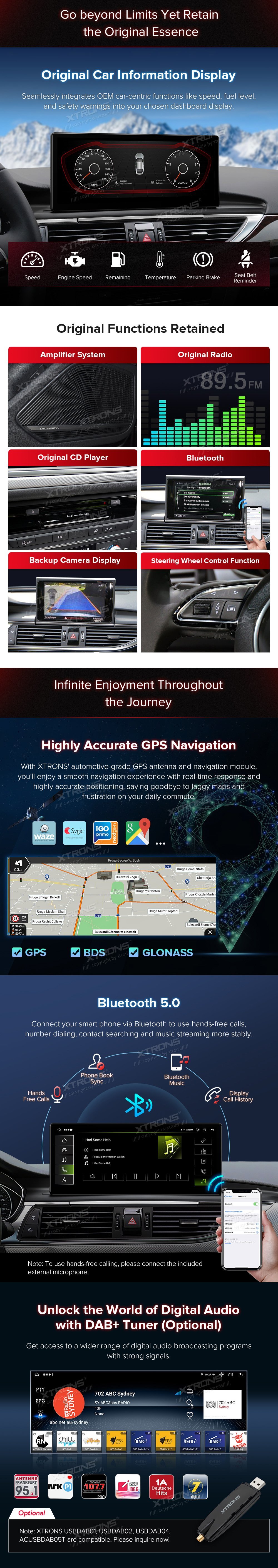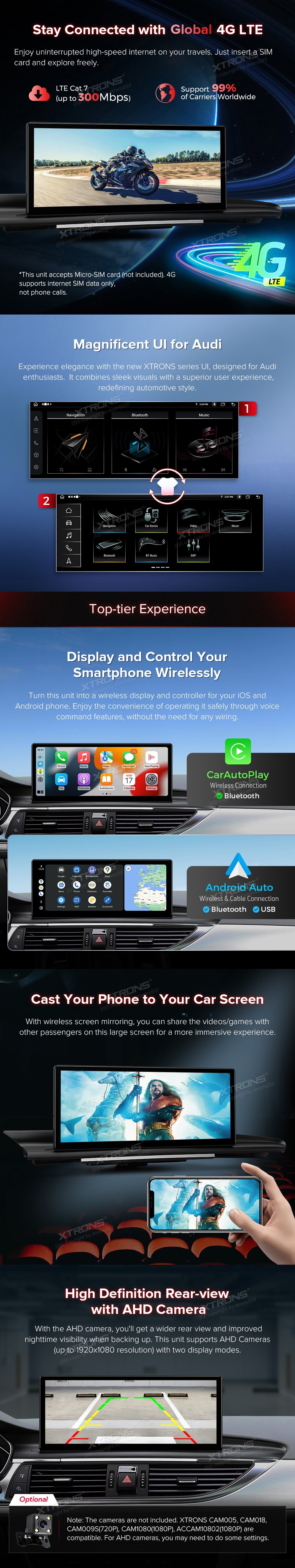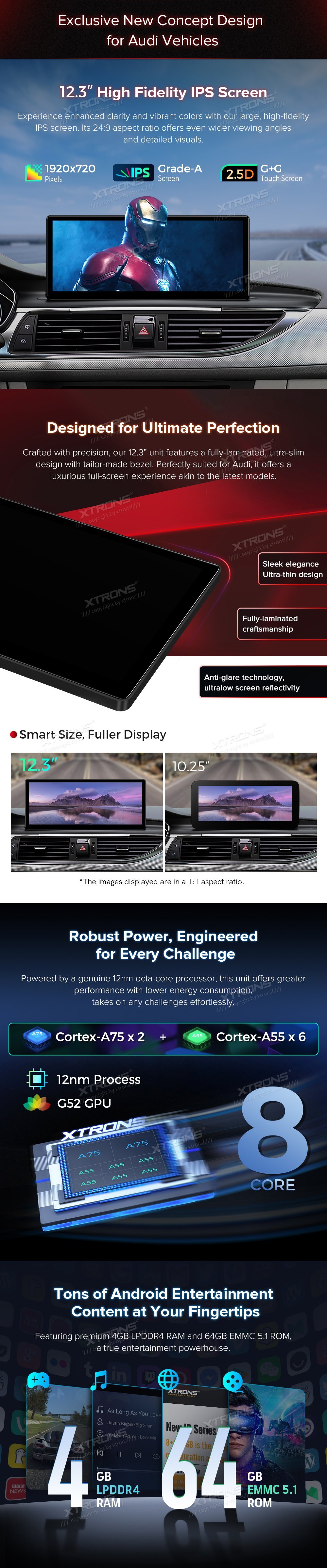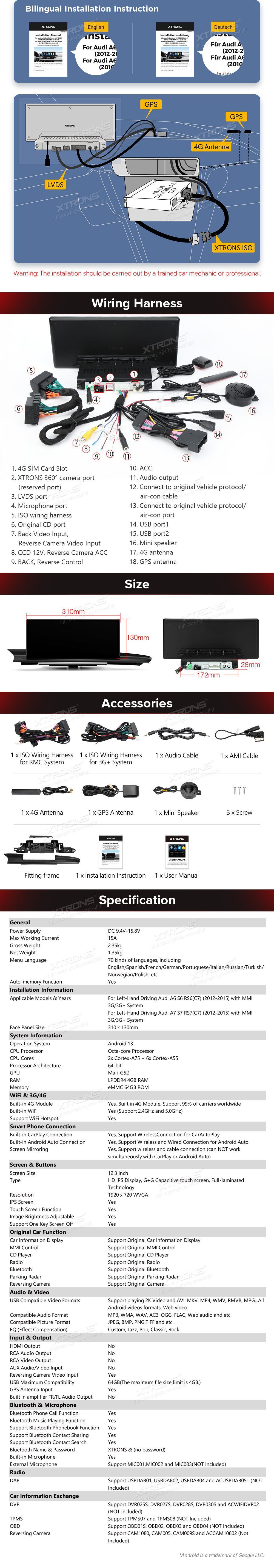 Autorádio pro vozy Audi řady A6, A7, RS6, RS7, S6, S7 - 12,3" HD dotykový displej IPS, Android 13, osmijádrový procesor, operační paměť 4GB, vnitřní paměť 64GB, GPS, Wifi, Bluetooth, RDS, 4G, USB, slot pro SD kartu, CarPlay, Apple play, AndroidAuto.