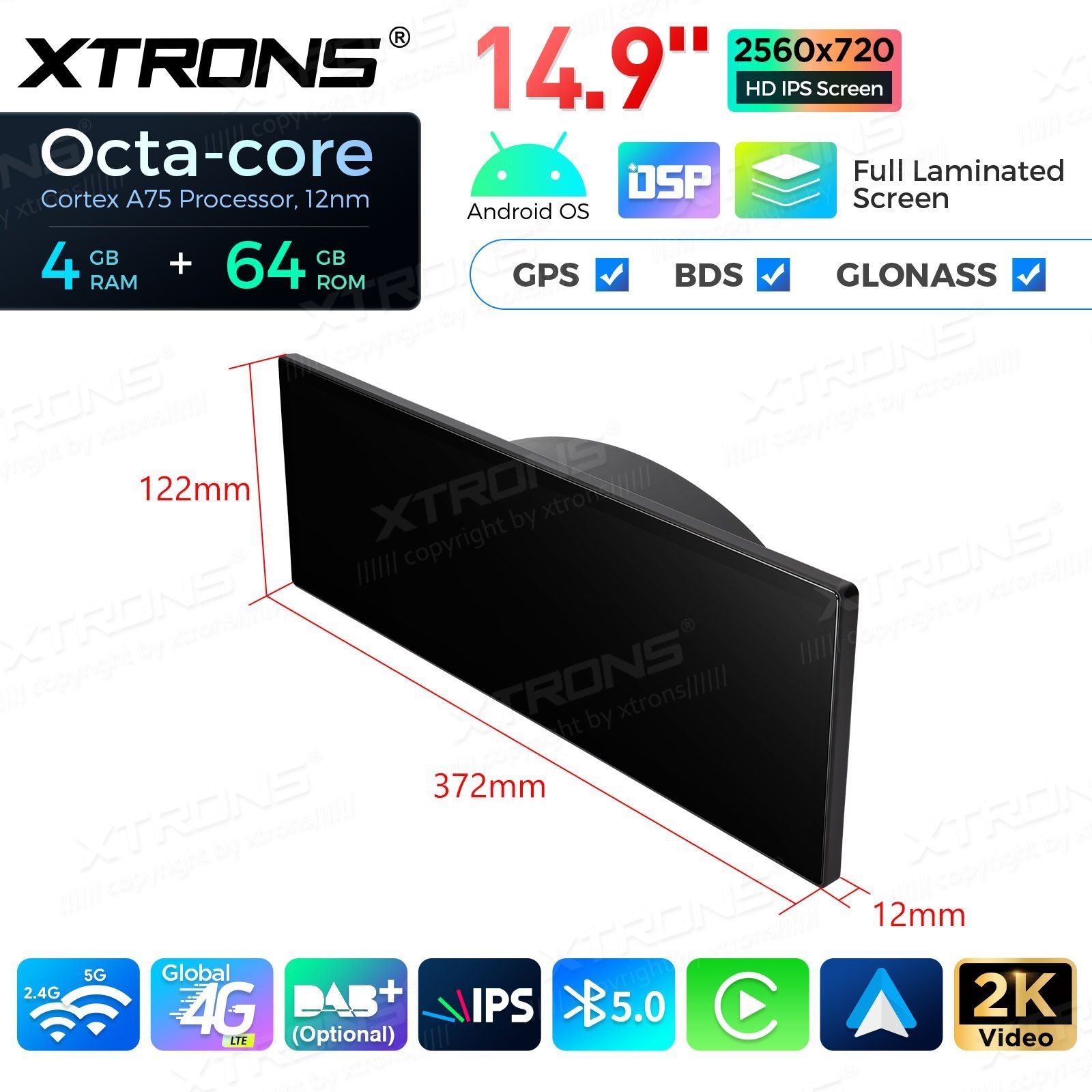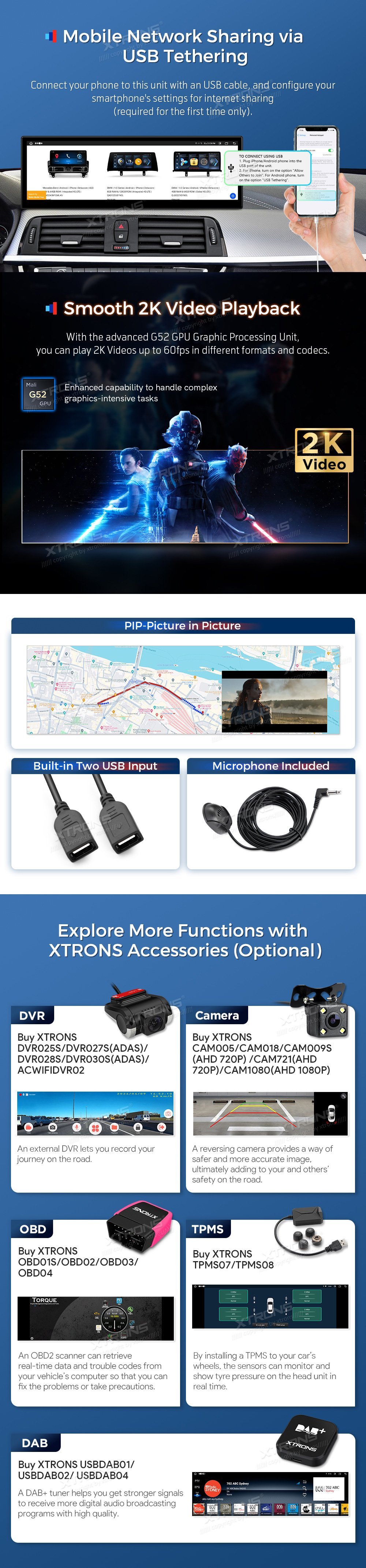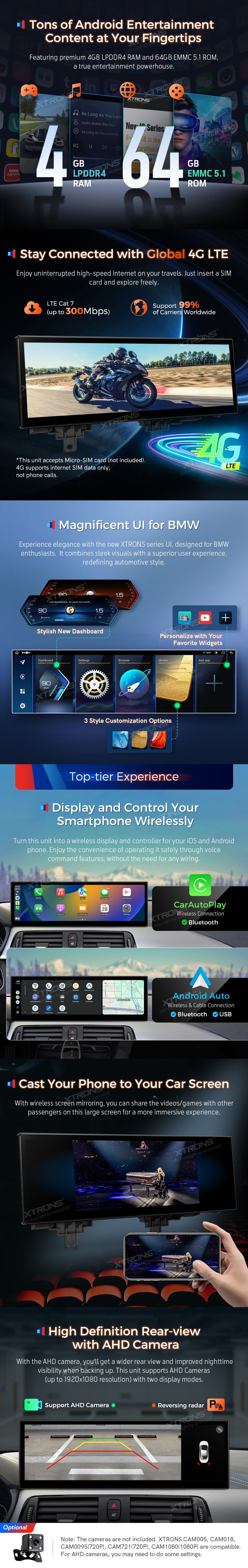 *14,9 palcový exkluzivní nový koncept Ultra-tenký design *2560*720 Super velký IPS 2.5D G+G Grade-A Obrazovka * Plně Laminovaná anti-Glare Screen *Android 14 Cortex A75 *2+A55*6 12nm Proces *Octa-Core LPDDR4 4GB+64GB ROM SSD *Global 4G LTE (Podpora 99 % dopravců po celém světě) * Stylové uživatelské téma *Wuilt-in Wireless CarPlay a bezdrátový a kabelový Android Auto *Screen zrcadlení *Podpora AHD kamery * Anglický a německý uživatelský manuál a průvodce instalací *Původní zobrazení informací o autech *Originální Funkce Zachovány -iDrive systém zachovaný -Zásobitelský systém -Originální rádio -Pravný CD přehrávač -Bluetooth -Backupní displej fotoaparátu - Funkce řízení kol *Postavitelný DSP *Pravná GPS navigace *Bluetooth 5.0 *Dual Band Wi-Fi (2.4GHz & 5GHz) *Sdílení Mobilní Sítě Přes USB Tethering *2K Video Přehrávání přehrávání * Multitaskový displej *PIP-Obrázek v obraze *Postava 2 USB vstup * V ceněn mikrofon *Prozkoumejte více funkcí s příslušenstvím XTRONS (volitelné) -DVR, Fotoaparát, OBD, TPMS a DAB