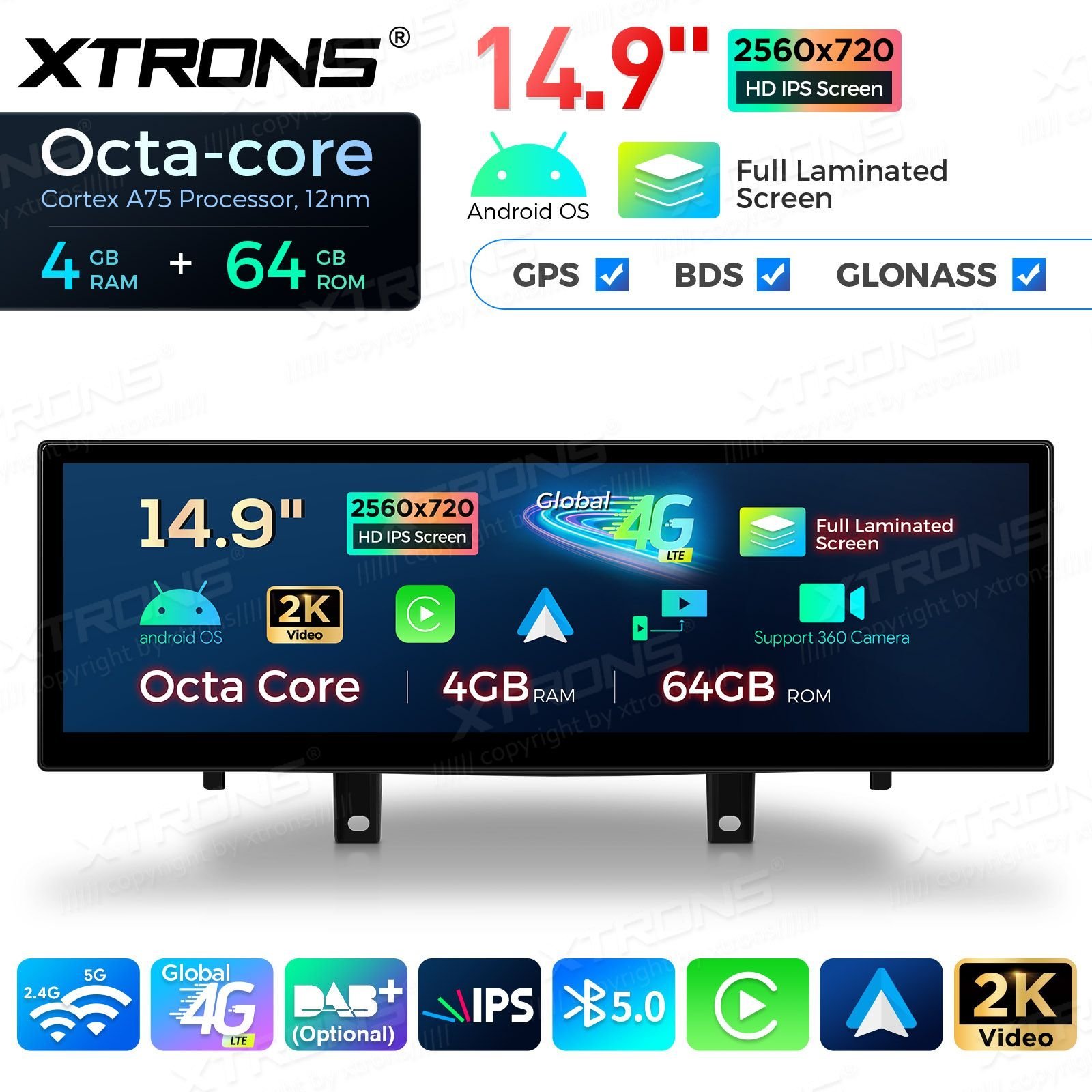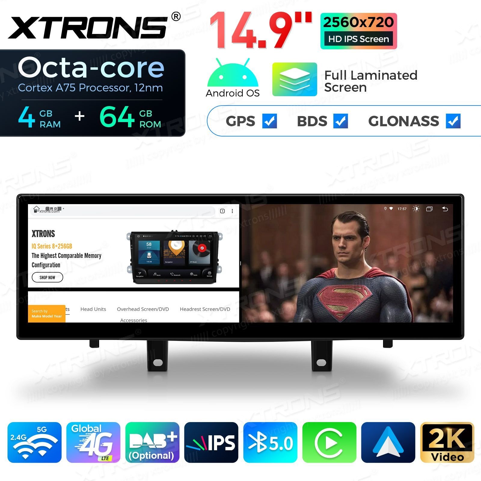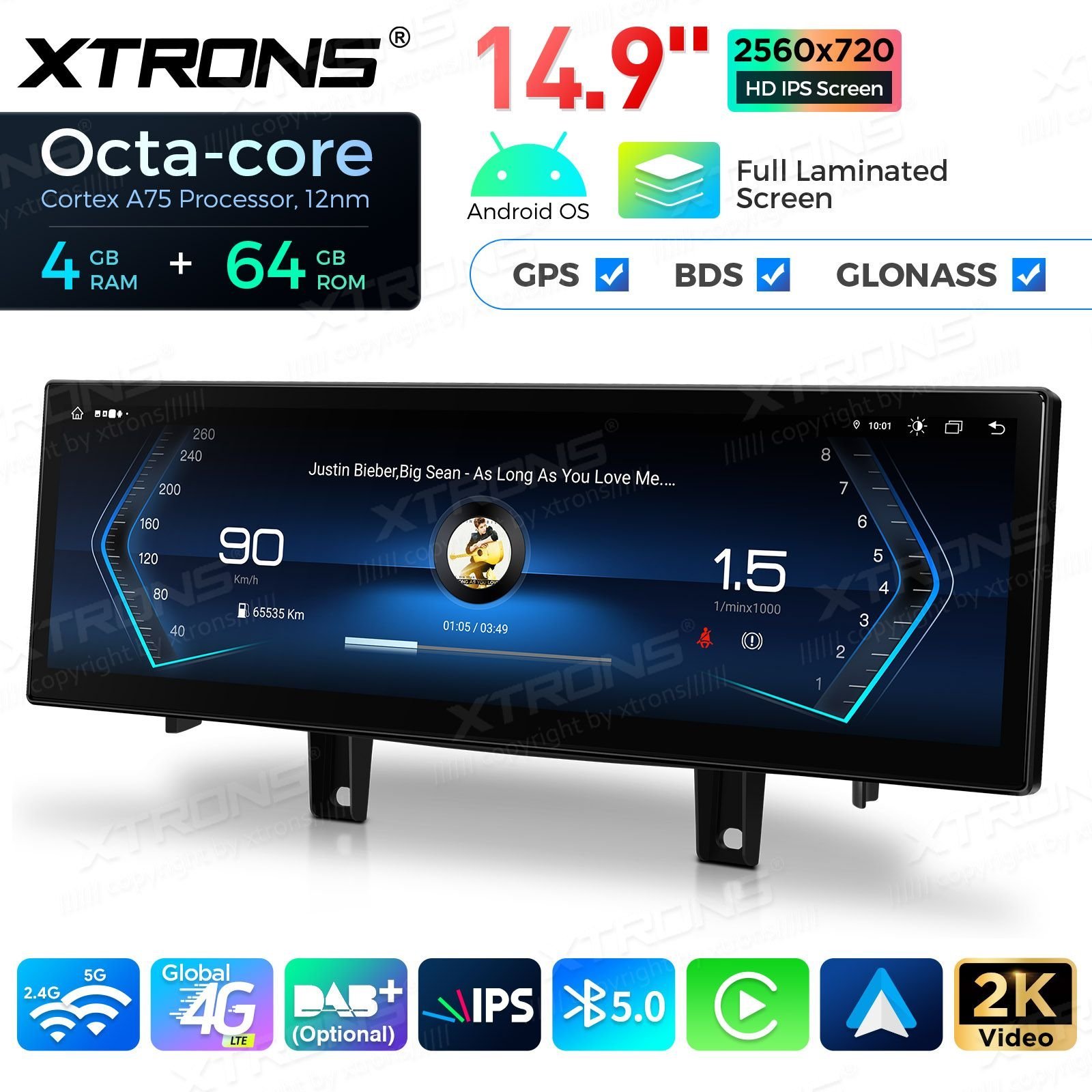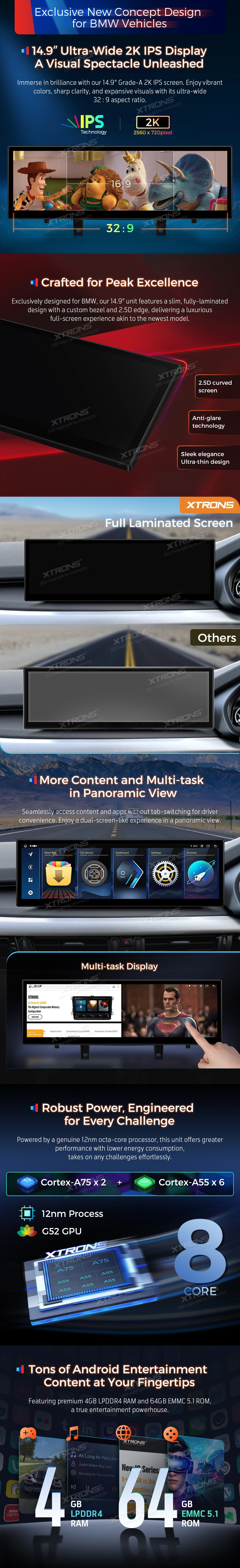 *14,9 palcový exkluzivní nový koncept Ultra-tenký design *2560*720 Super velký IPS 2.5D G+G Grade-A Obrazovka * Plně Laminovaná anti-Glare Screen *Android 14 Cortex A75 *2+A55*6 12nm Proces *Octa-Core LPDDR4 4GB+64GB ROM SSD *Global 4G LTE (Podpora 99 % dopravců po celém světě) * Stylové uživatelské téma *Wuilt-in Wireless CarPlay a bezdrátový a kabelový Android Auto *Screen zrcadlení *Podpora AHD kamery * Anglický a německý uživatelský manuál a průvodce instalací *Původní zobrazení informací o autech *Originální Funkce Zachovány -iDrive systém zachovaný -Zásobitelský systém -Originální rádio -Pravný CD přehrávač -Bluetooth -Backupní displej fotoaparátu - Funkce řízení kol *Postavitelný DSP *Pravná GPS navigace *Bluetooth 5.0 *Dual Band Wi-Fi (2.4GHz & 5GHz) *Sdílení Mobilní Sítě Přes USB Tethering *2K Video Přehrávání přehrávání * Multitaskový displej *PIP-Obrázek v obraze *Postava 2 USB vstup * V ceněn mikrofon *Prozkoumejte více funkcí s příslušenstvím XTRONS (volitelné) -DVR, Fotoaparát, OBD, TPMS a DAB