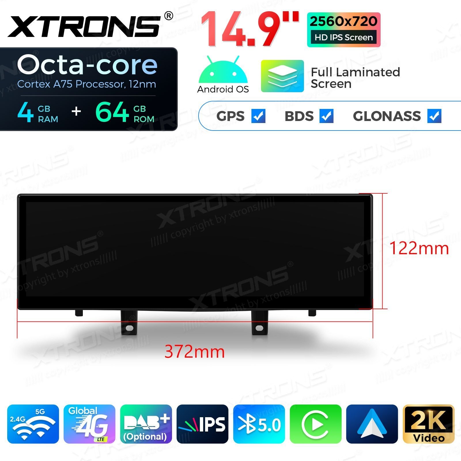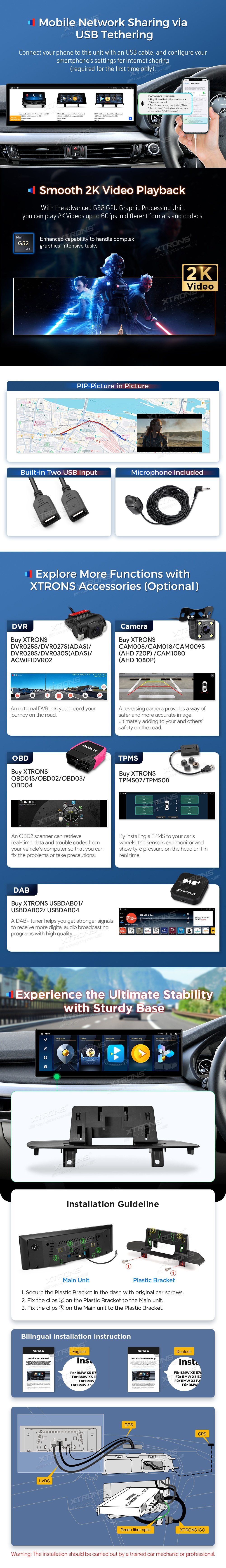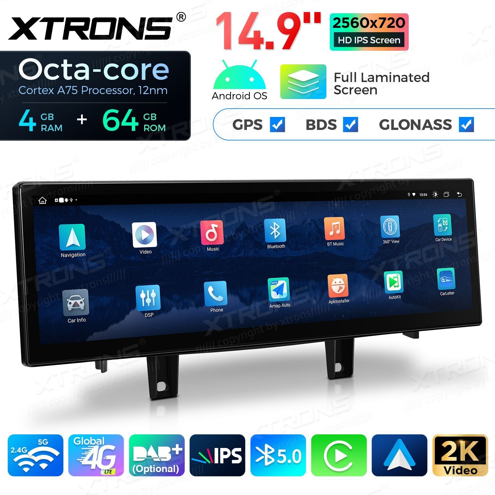 *14,9 palcový exkluzivní nový koncept Ultra-tenký design *2560*720 Super velký IPS 2.5D G+G Grade-A Obrazovka * Plně Laminovaná anti-Glare Screen *Android 14 Cortex A75 *2+A55*6 12nm Proces *Octa-Core LPDDR4 4GB+64GB ROM SSD *Global 4G LTE (Podpora 99 % dopravců po celém světě) * Stylové uživatelské téma *Wuilt-in Wireless CarPlay a bezdrátový a kabelový Android Auto *Screen zrcadlení *Podpora AHD kamery * Anglický a německý uživatelský manuál a průvodce instalací *Původní zobrazení informací o autech *Originální Funkce Zachovány -iDrive systém zachovaný -Zásobitelský systém -Originální rádio -Pravný CD přehrávač -Bluetooth -Backupní displej fotoaparátu - Funkce řízení kol *Postavitelný DSP *Pravná GPS navigace *Bluetooth 5.0 *Dual Band Wi-Fi (2.4GHz & 5GHz) *Sdílení Mobilní Sítě Přes USB Tethering *2K Video Přehrávání přehrávání * Multitaskový displej *PIP-Obrázek v obraze *Postava 2 USB vstup * V ceněn mikrofon *Prozkoumejte více funkcí s příslušenstvím XTRONS (volitelné) -DVR, Fotoaparát, OBD, TPMS a DAB