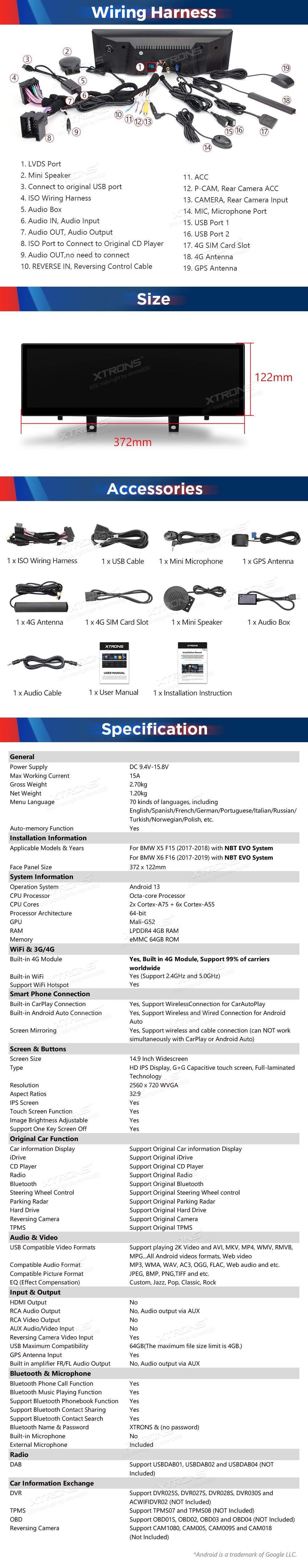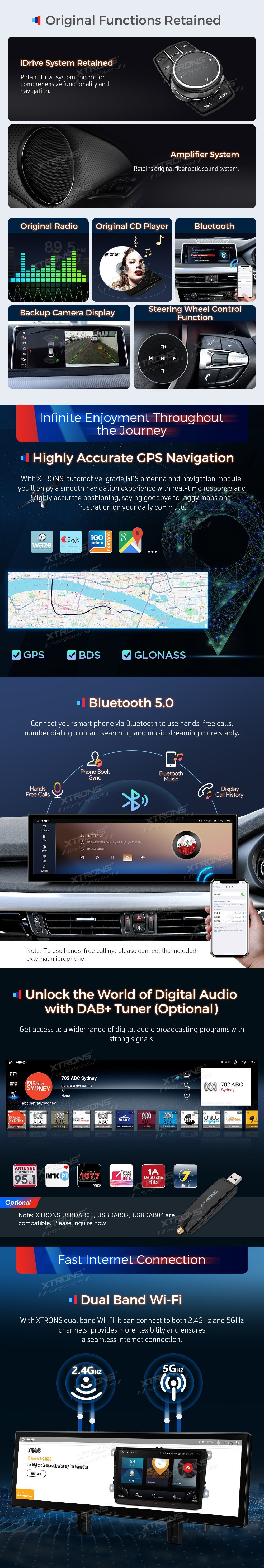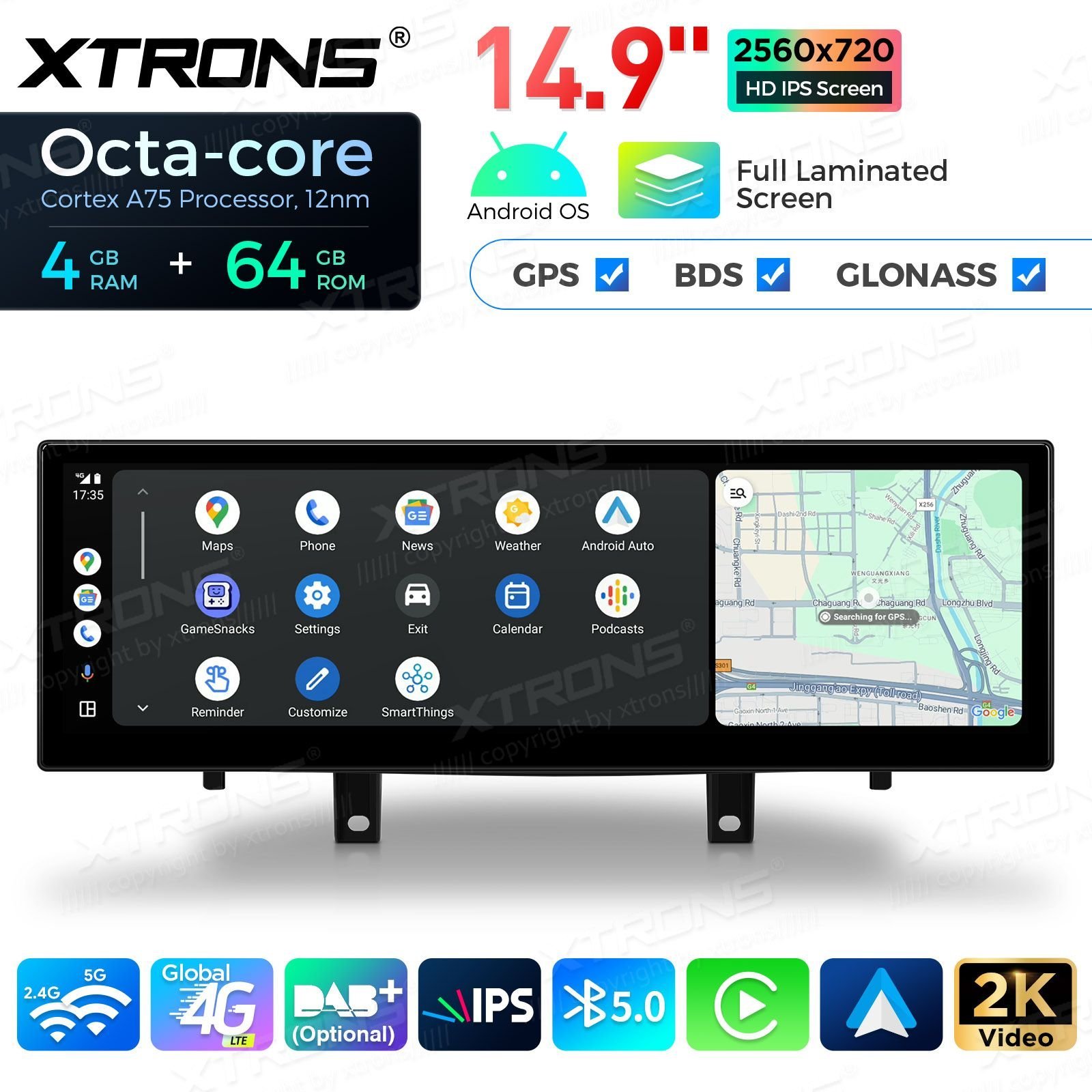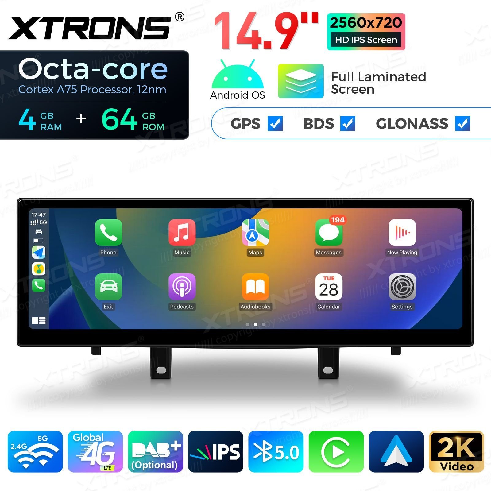 *14,9 palcový exkluzivní nový koncept Ultra-tenký design *2560*720 Super velký IPS 2.5D G+G Grade-A Obrazovka * Plně Laminovaná anti-Glare Screen *Android 14 Cortex A75 *2+A55*6 12nm Proces *Octa-Core LPDDR4 4GB+64GB ROM SSD *Global 4G LTE (Podpora 99 % dopravců po celém světě) * Stylové uživatelské téma *Wuilt-in Wireless CarPlay a bezdrátový a kabelový Android Auto *Screen zrcadlení *Podpora AHD kamery * Anglický a německý uživatelský manuál a průvodce instalací *Původní zobrazení informací o autech *Originální Funkce Zachovány -iDrive systém zachovaný -Zásobitelský systém -Originální rádio -Pravný CD přehrávač -Bluetooth -Backupní displej fotoaparátu - Funkce řízení kol *Postavitelný DSP *Pravná GPS navigace *Bluetooth 5.0 *Dual Band Wi-Fi (2.4GHz & 5GHz) *Sdílení Mobilní Sítě Přes USB Tethering *2K Video Přehrávání přehrávání * Multitaskový displej *PIP-Obrázek v obraze *Postava 2 USB vstup * V ceněn mikrofon *Prozkoumejte více funkcí s příslušenstvím XTRONS (volitelné) -DVR, Fotoaparát, OBD, TPMS a DAB