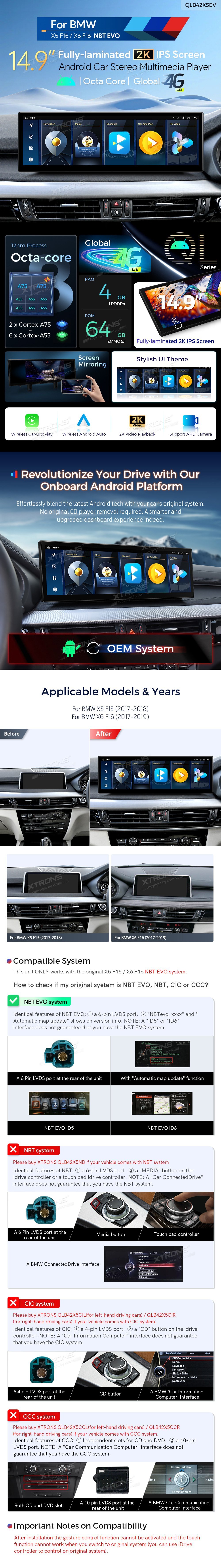 14,9" dotykový displej pro BMW X5 F15 (2017-2018) / X6 F16 (2017-2019) EVO Octa Core 4+64GB Global 4G LTE Android 14 Stereo Multimedia Player s plně ladící 2K IPS