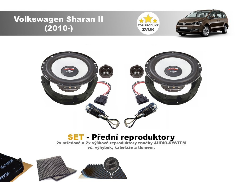 Set reproduktorů do Volkswagen Sharan II (2010-) německé značky Audio System s veškerým příslušenstvím pro montáž a tlumícími materiály, které maximálně zefektivní zvuk reproduktorů.