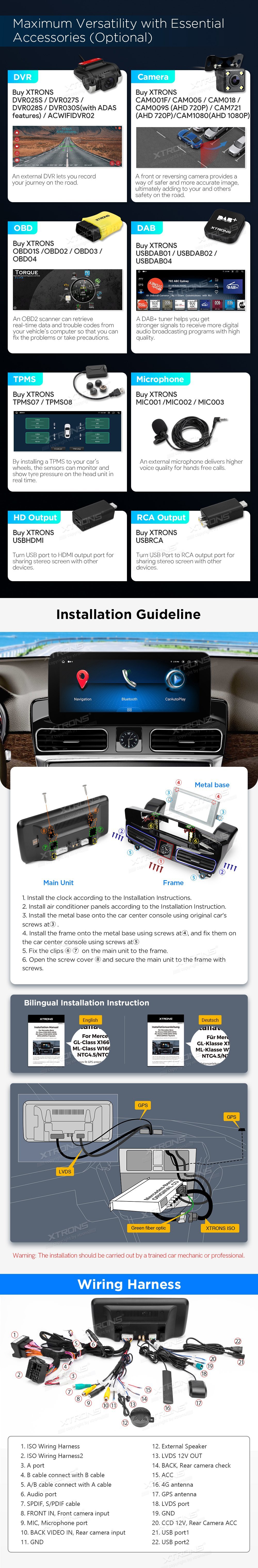 *2K Video přehrávač * Vestavěné bezdrátové CarPlay a bezdrátový a USB kabel Android Auto * Původní funkce zůstaly zachovány -Řadič COMAND -SWC Zachovány -Původní kamera zůstala -Původní CD přehrávač zachován -Optický Vláknový Zesilovač Uchováván *Původní informační displej automobilu * Duální Wi-Fi Band Připojení (2.4GHz & 5GHz) * Nejnovější Bluetooth 5.1 * Vysoce citlivý GPS čip * Multi-task Display *Povolen režim PIP *Mediální přehrávač * Podpora AHD kamery *Volitelné příslušenství pro zdokonalení vašeho uživatelského prostředí - DVR, kamera, OBD, DAB, TPMS, mikrofon, HD / RCA výstup