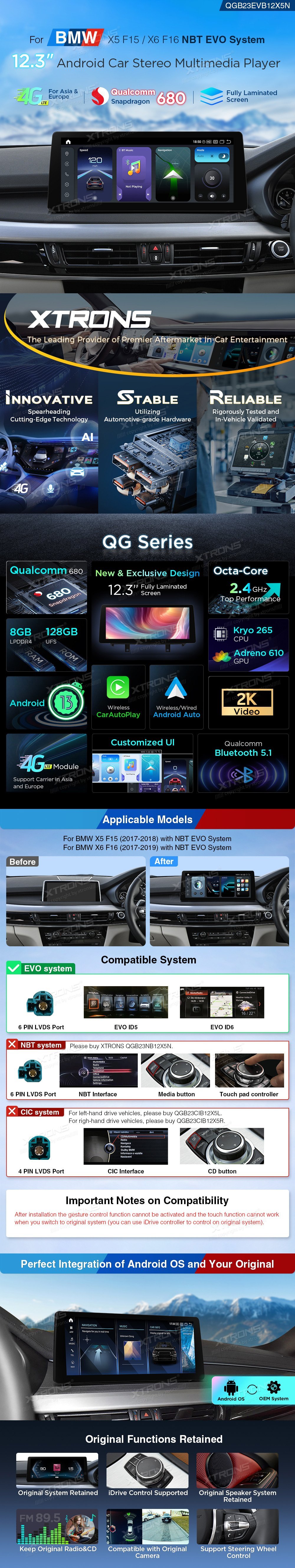12,3 palcová obrazovka pro BMW X5 F15 (2017-2018) X6 F16 (2017-2019)Původní systém EVO Octa Core 8+128 Car Stereo Multimedia přehrávač s plně laminovanou obrazovkou