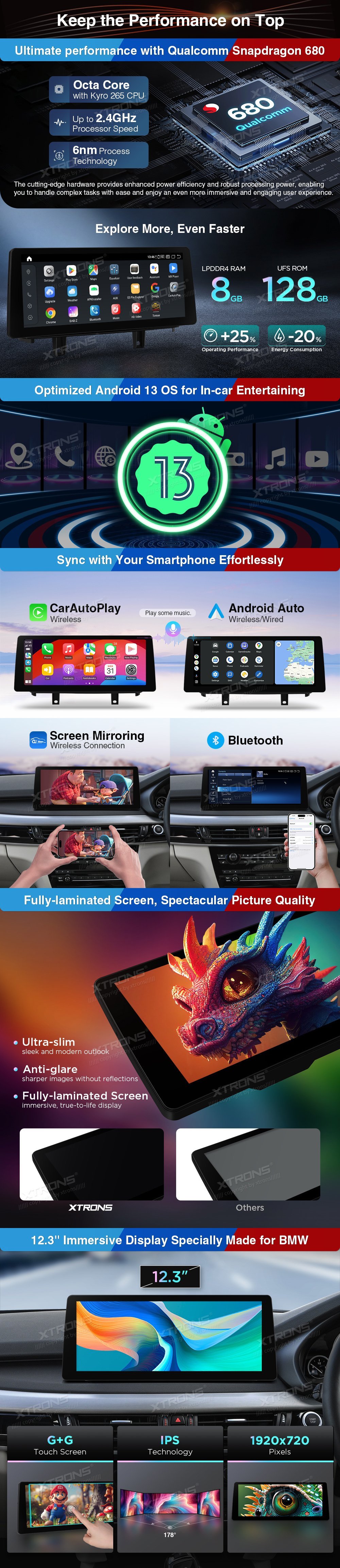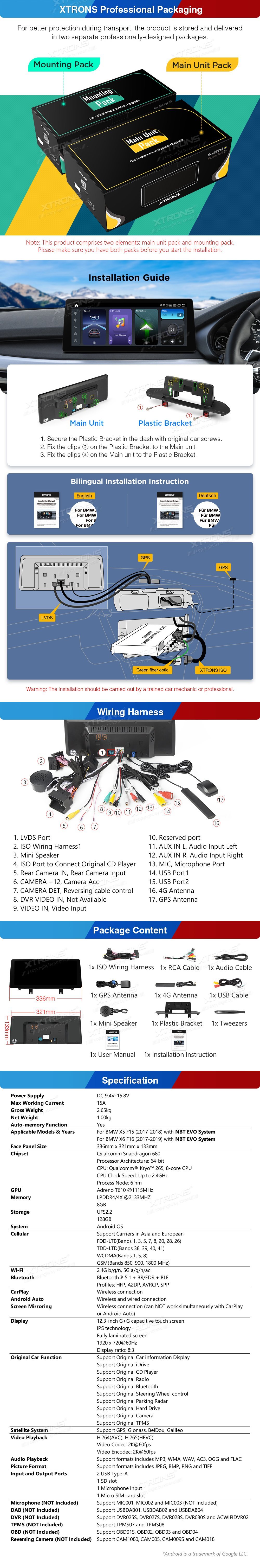 *Android 14 Octa-Core 12nm Proces * DDR4 8GB RAM + 128GB ROM * Nejnovější Bluetooth 5.1 * 12,3 palce 1920 * 720P IPS G + G HD dotyková obrazovka * Plná laminovaná obrazovka * Podpora 2K Video * Připojení 4G nové generace * Duální Wi-Fi Band Připojení (2.4GHz & 5GHz) * Built-in bezdrátové CarPlay a bezdrátové a kabelové Android Auto * Vestavěný DSP *Původní funkce zachována -iDrive systém zachován -Systém zesilovačů -Bluetoothová -Podporovat původní rádio -Podporovat originální CD přehrávač -Záložní displej fotoaparátu *6 Témata UI * denní a noční režimy * Podpora záložní kamery AHD *Přesná GPS navigace * Multi-task Display *Povolen režim PIP *Mediální přehrávač * AUX Audio výstup *Volitelné příslušenství pro zdokonalení vašeho uživatelského prostředí - DVR, fotoaparát, OBD, DAB, TPMS a mikrofon