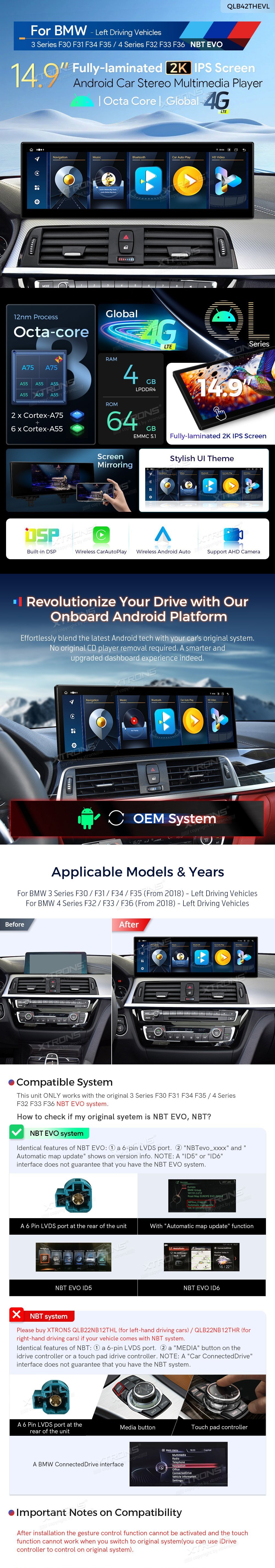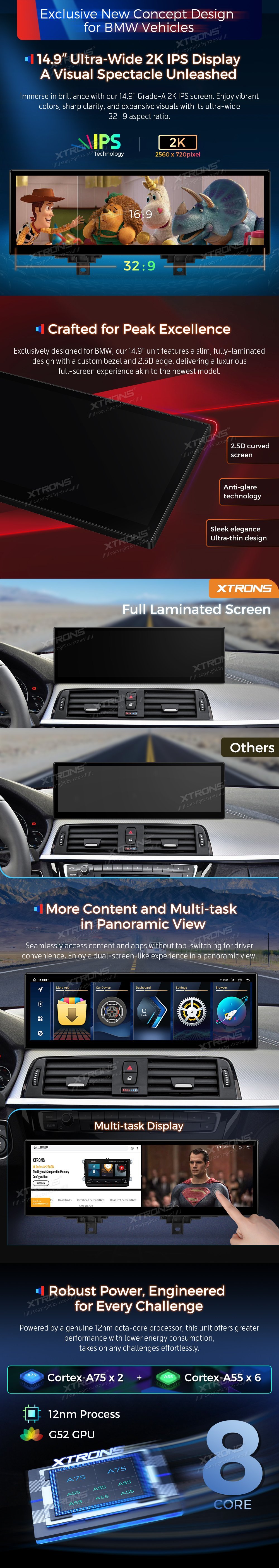 Autorádio pro vozy BMW 3 (F30,F31,F34,F35), 4 (F32, F33, F36) - 14.9" HD dotykový displej IPS, Android 14, osmijádrový procesor, operační paměť 4GB, vnitřní paměť 64GB, DSP, GPS, Wifi, Bluetooth, RDS, 4G, USB, slot pro SD kartu, CarPlay, AndroidAuto.