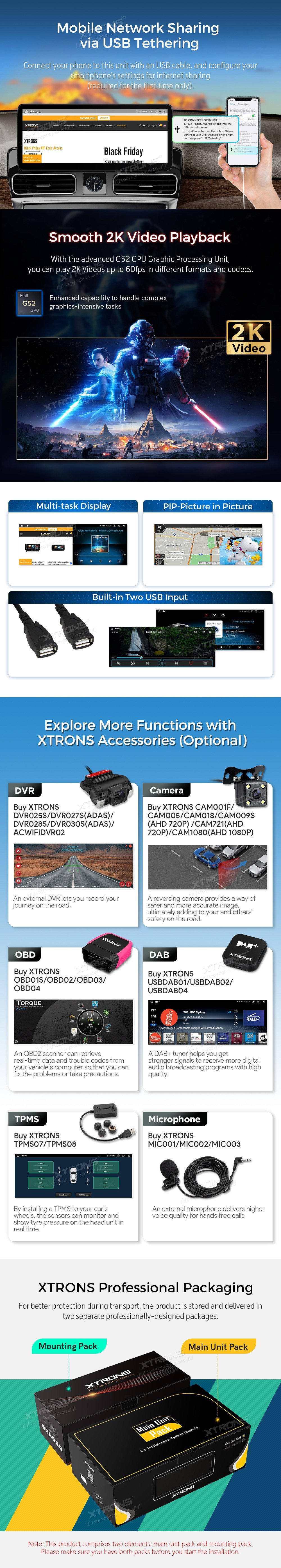 *Přesná GPS navigace *Bluetooth 5.0 * Duální pásmo Wi-Fi (2.4GHz a 5GHz) * Sdílení Mobilních Sítí Prostřednictvím USB Tetheringu * 2K přehrávání videa * Multi-task Display *PIP-Obrázek v obraze * Vestavený 2 USB vstup * Prozkoumat více funkcí s příslušenstvím XTRONS (volitelné) -DVR, kamera, OBD, DAB, TPMS a mikrofon